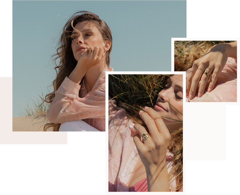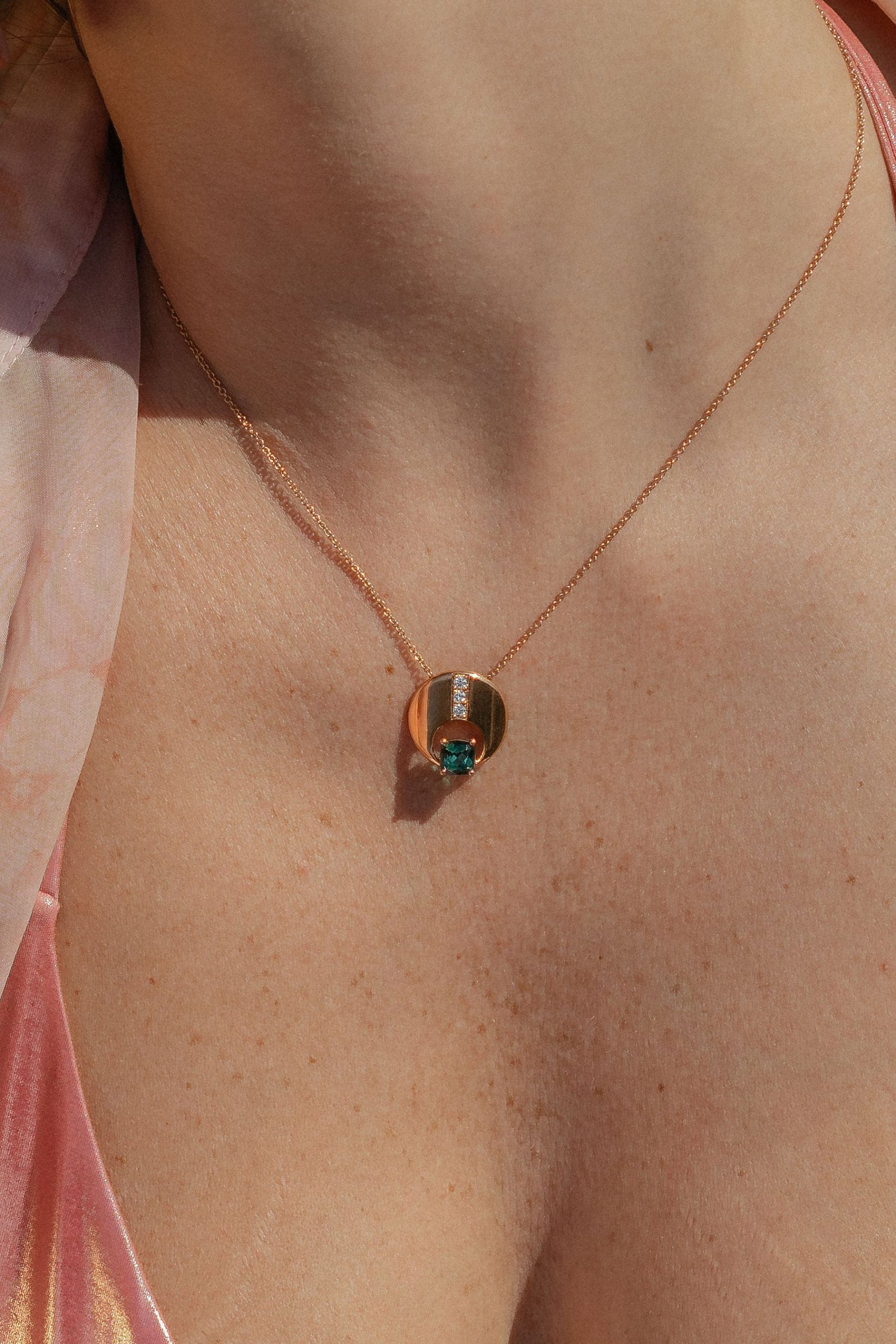 La complicité entre la tourmaline verte et les diamants naturels illumine le visage avec douceur.