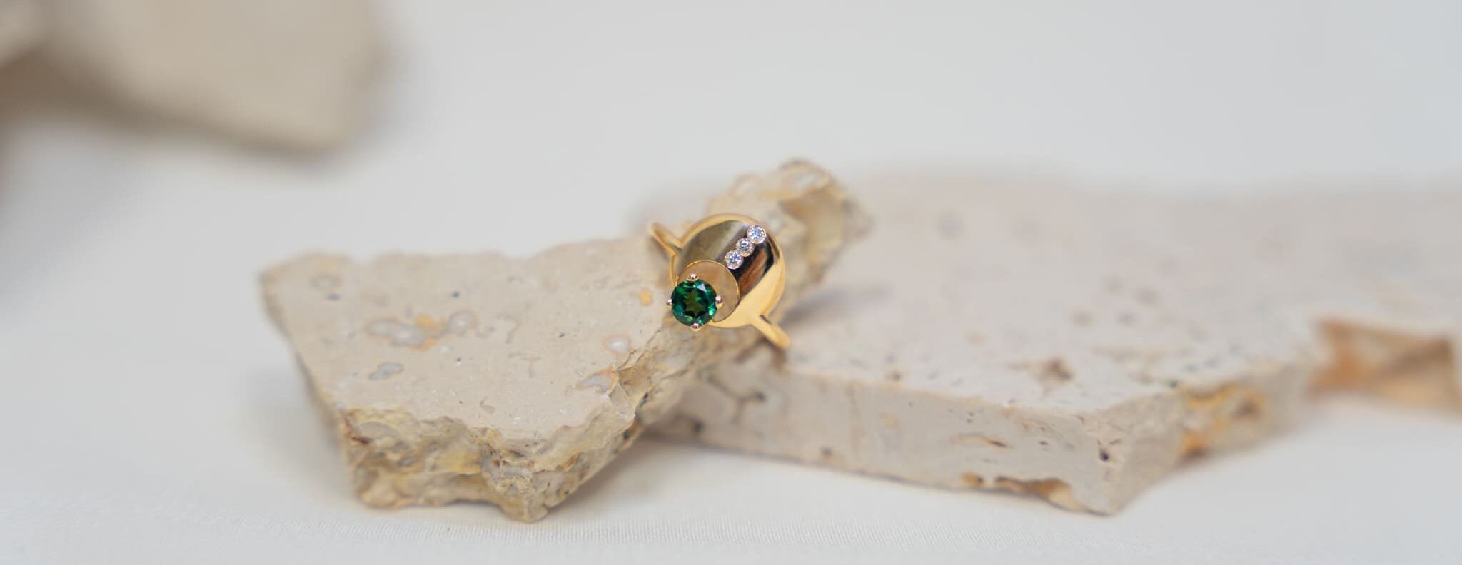 Une sphère lisse sertie de trois diamants naturels et d’une tourmaline ronde d’un vert profond.