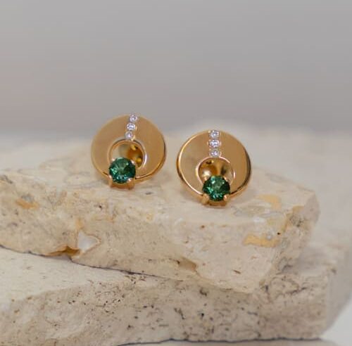 La complicité entre la tourmaline verte et les diamants naturels illumine le visage avec douceur.