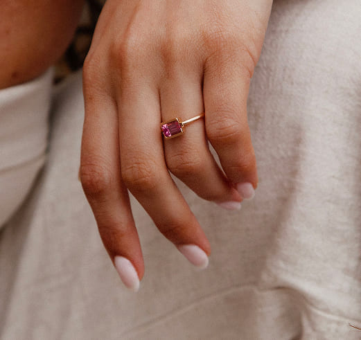 Bague minimaliste au design raffiné, mettant en lumière une tourmaline rose ou une tourmaline verte octogonale.