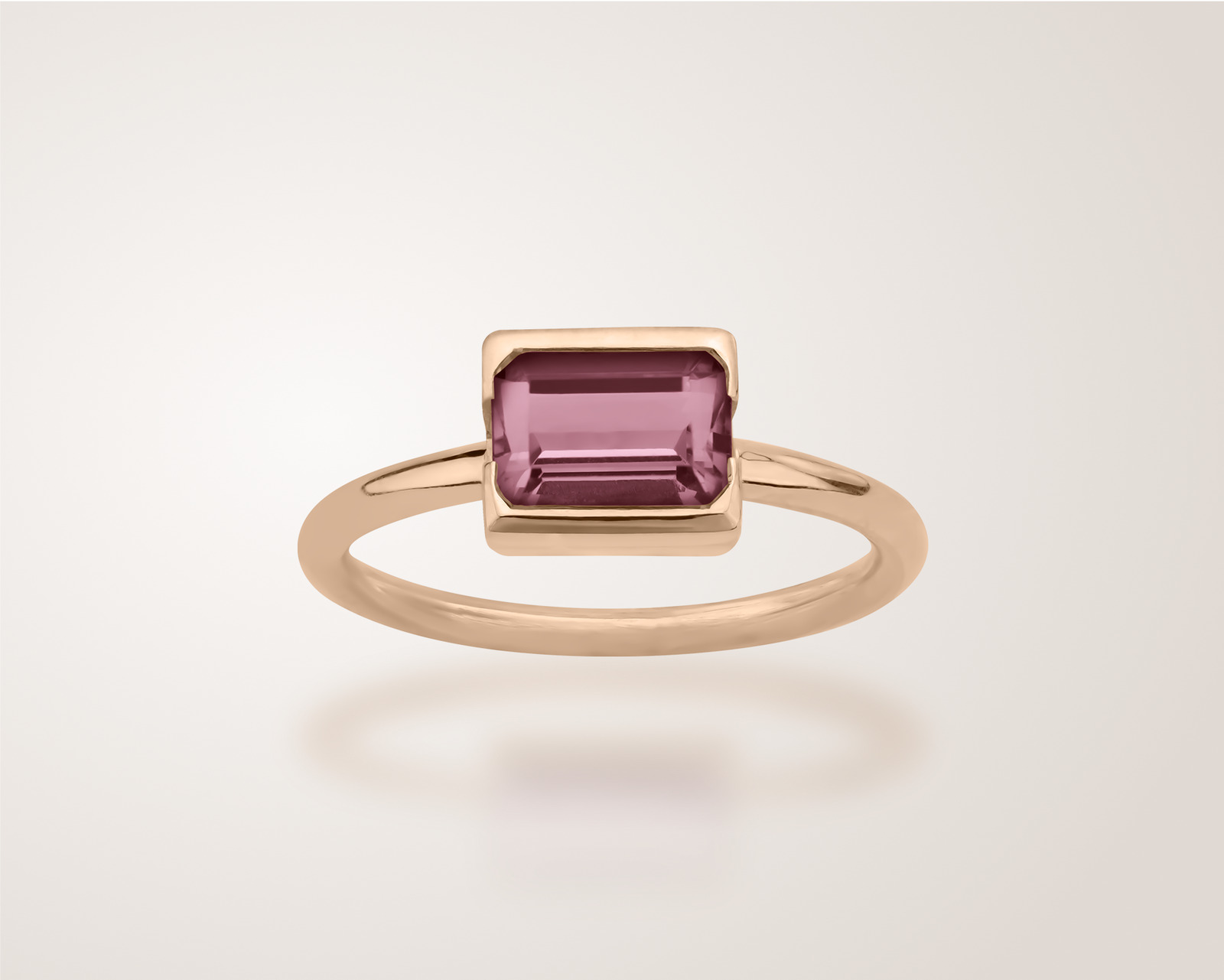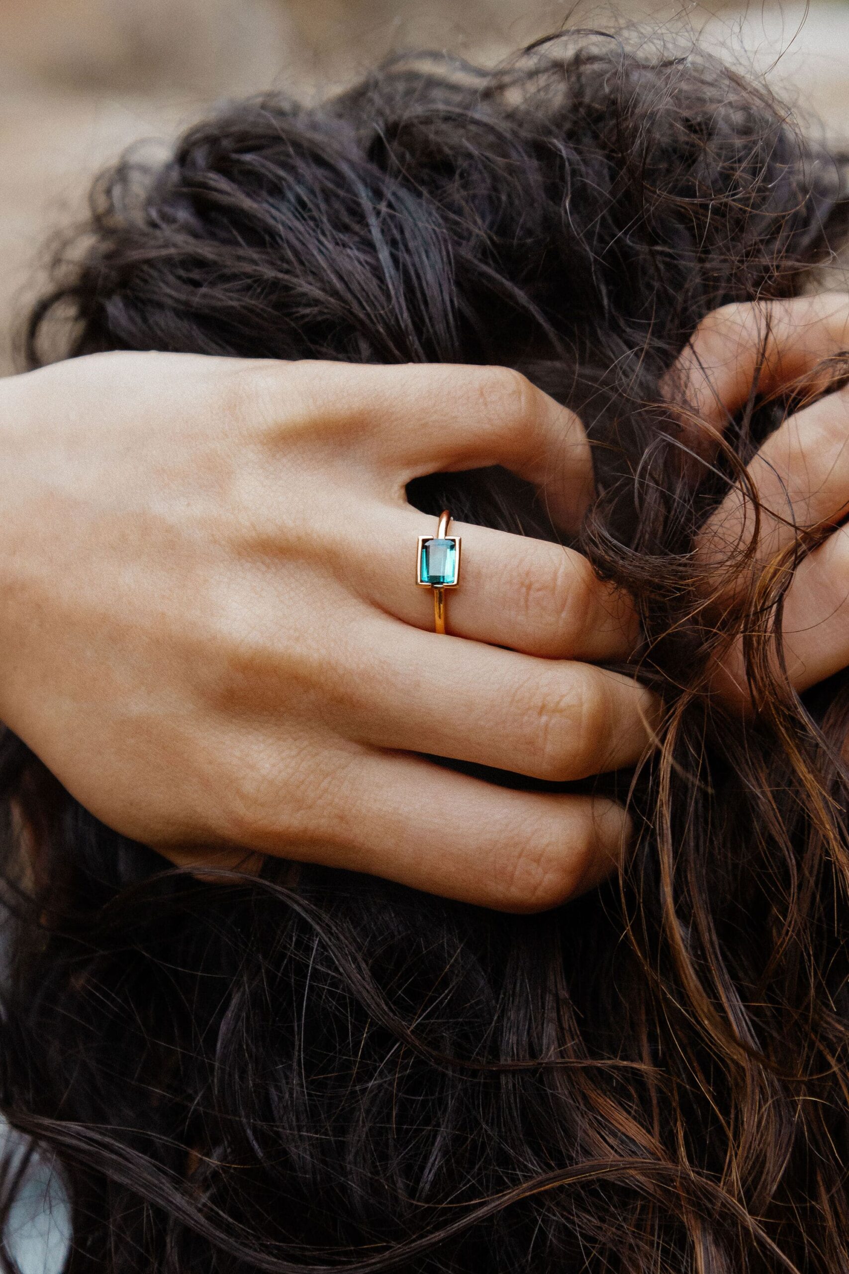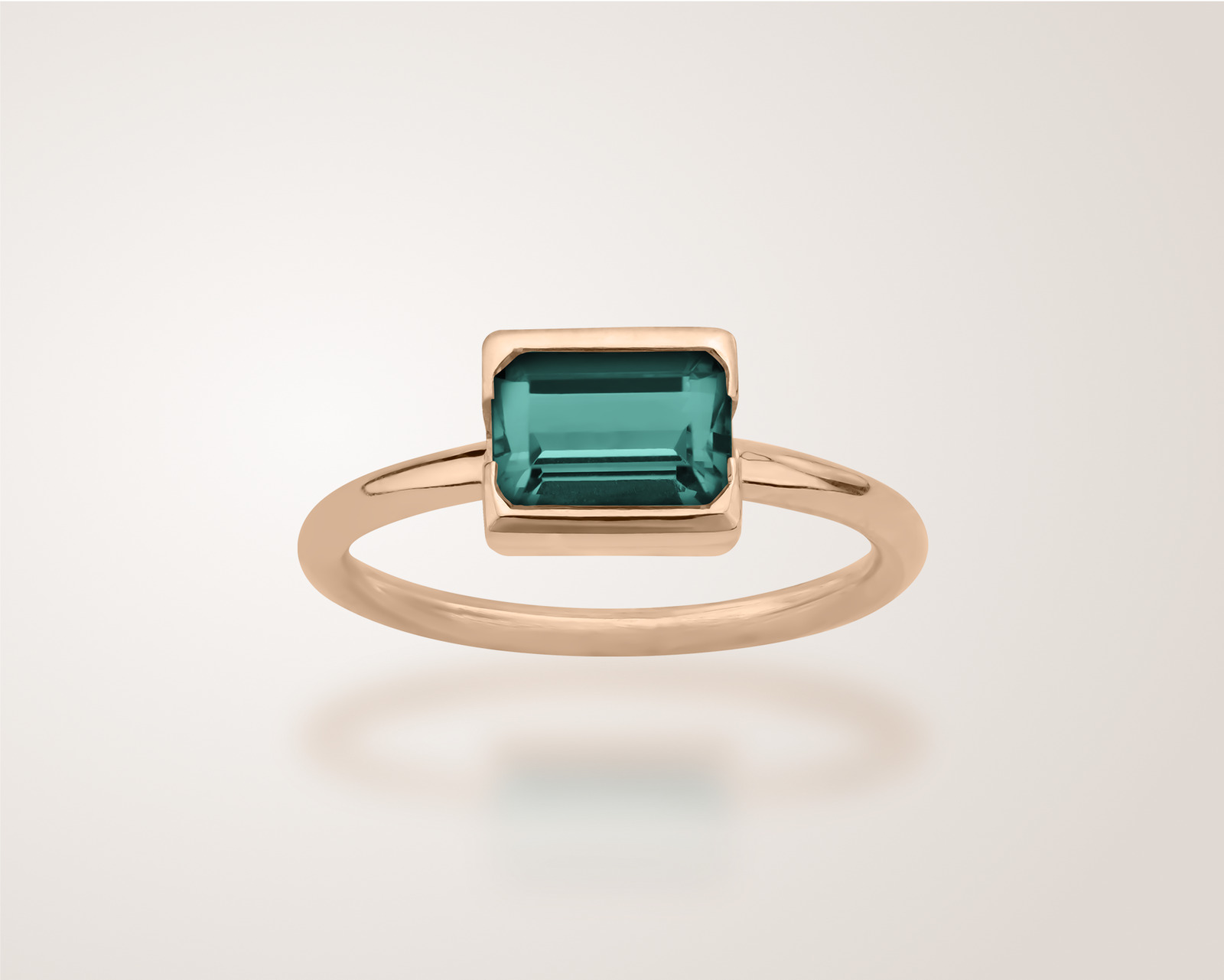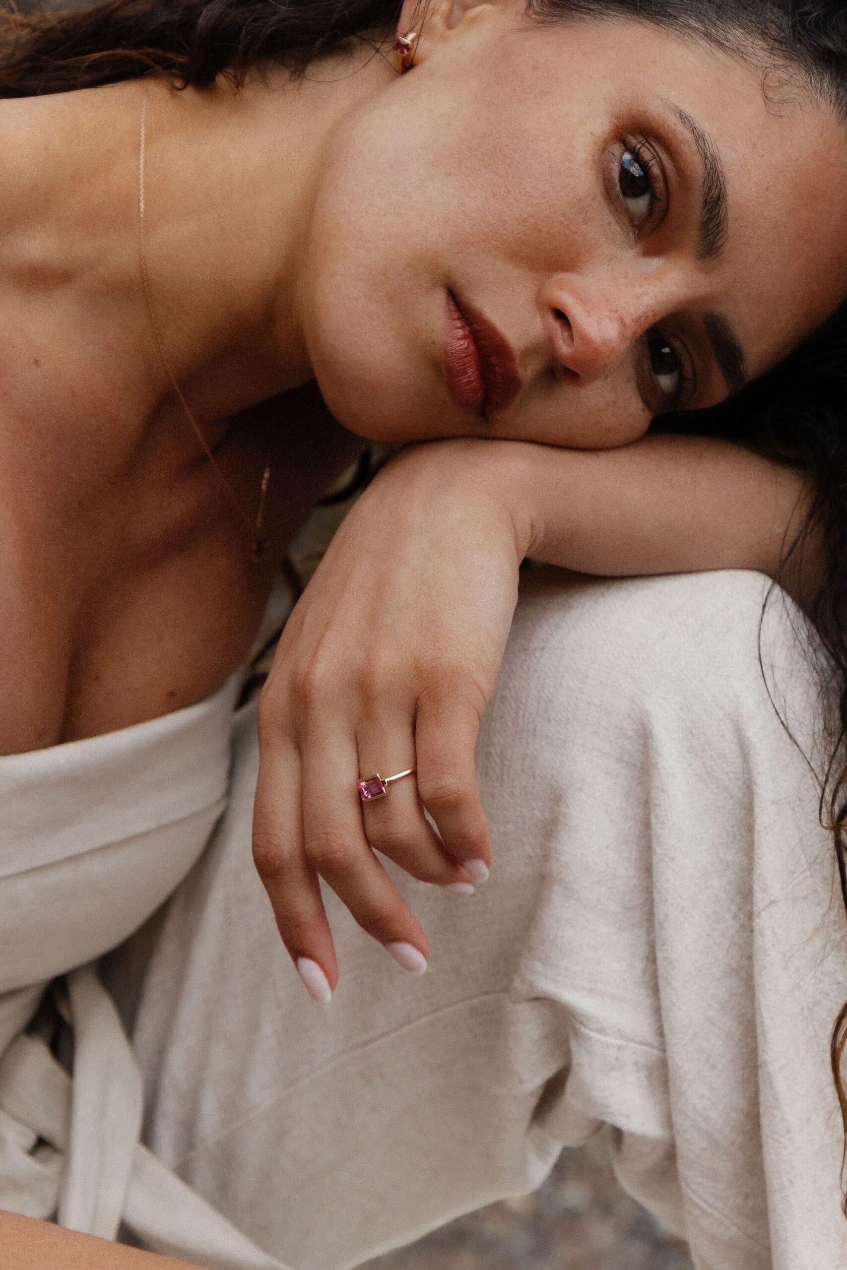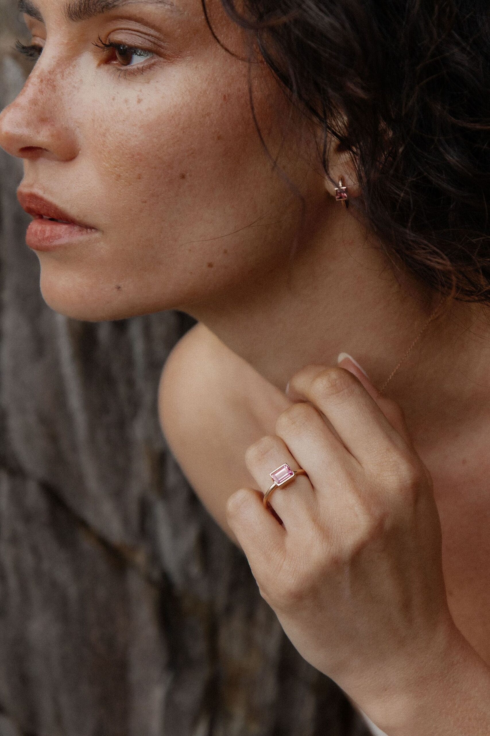 Bague minimaliste au design raffiné, mettant en lumière une tourmaline rose ou une tourmaline verte octogonale.