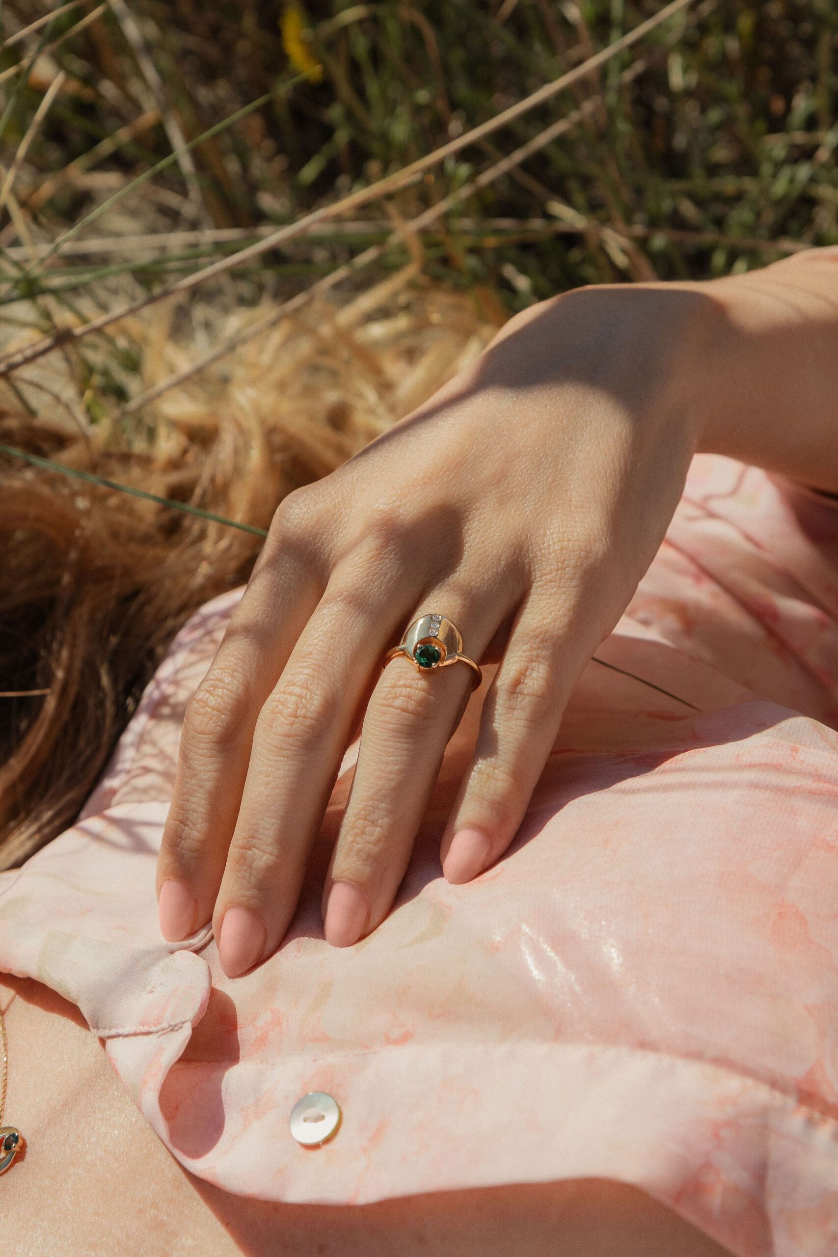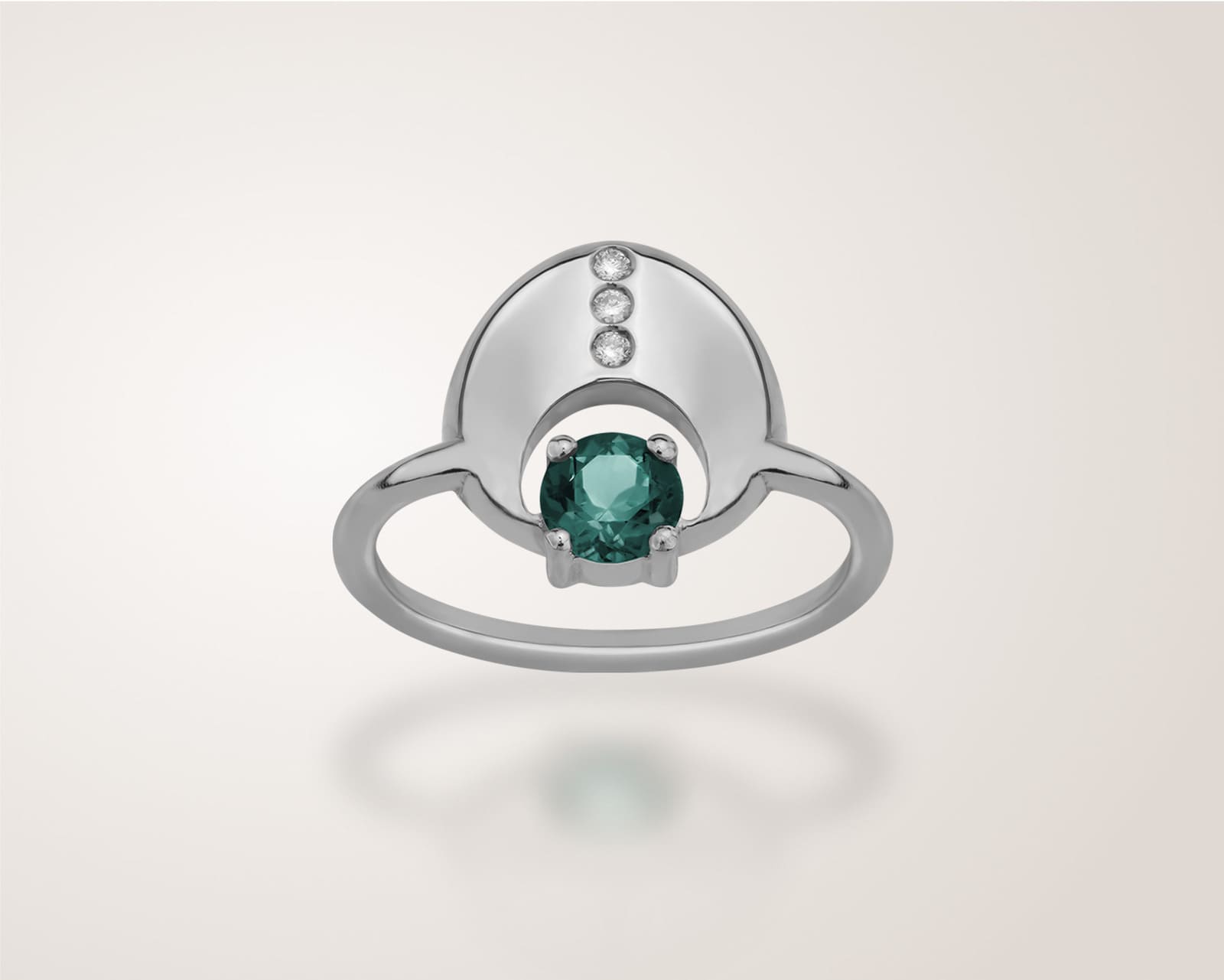 Bague aux courbes voluptueuses, centrée sur une sphère lisse sertie de trois diamants