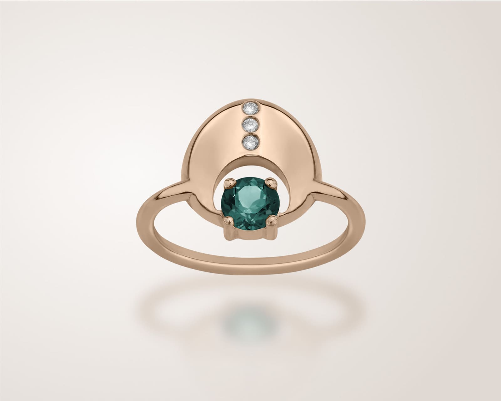 Bague aux courbes voluptueuses, centrée sur une sphère lisse sertie de trois diamants