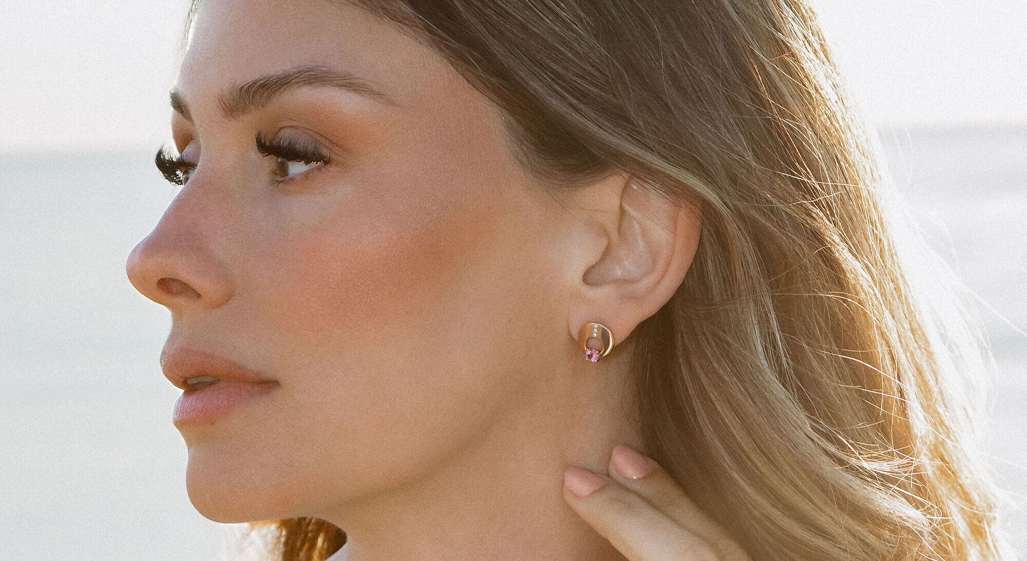 La complicité entre les pierres fines et les diamants naturels illumine le visage avec douceur.