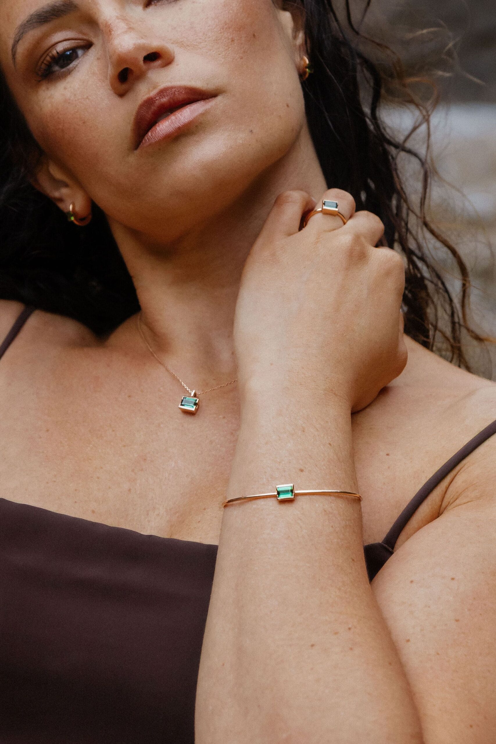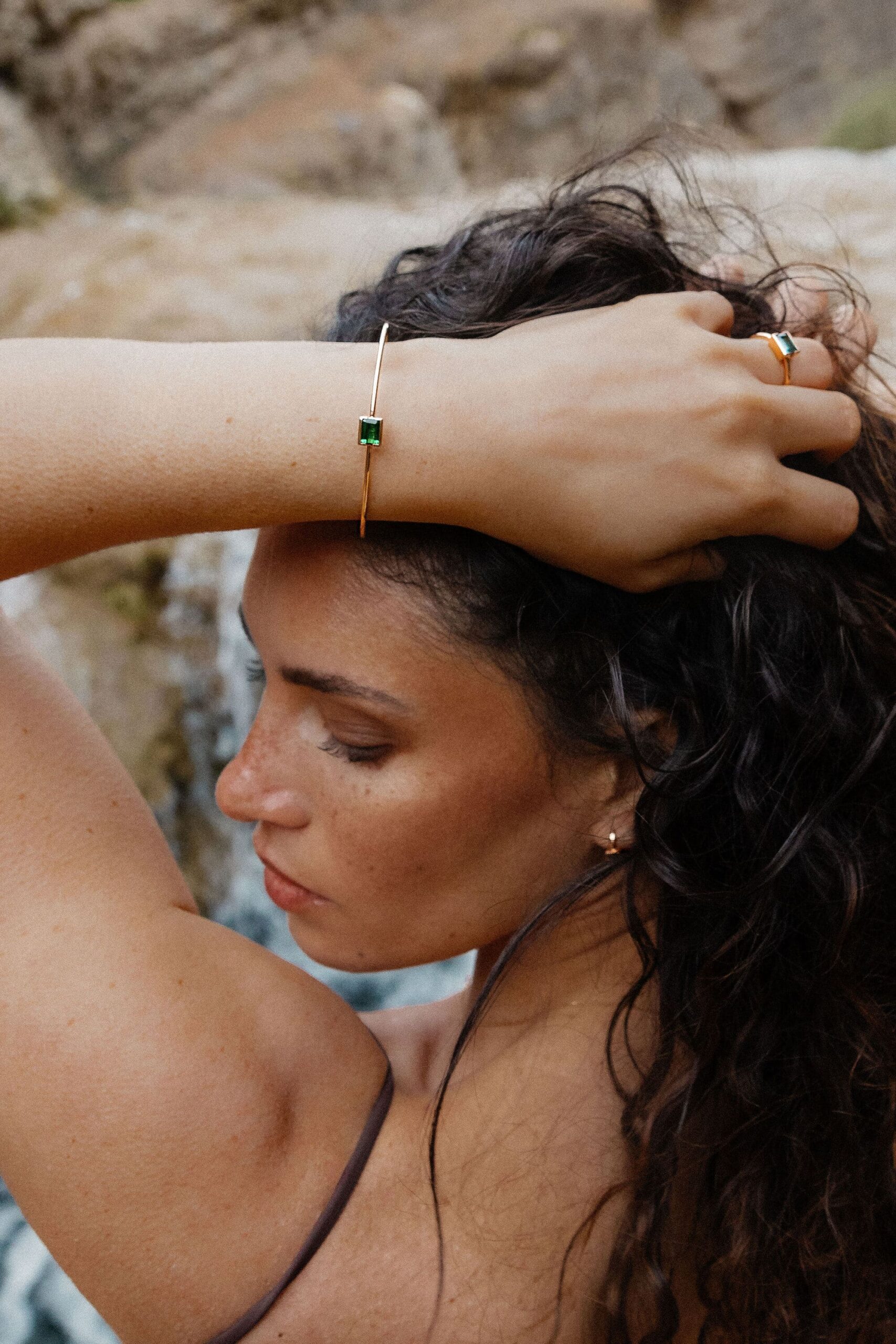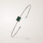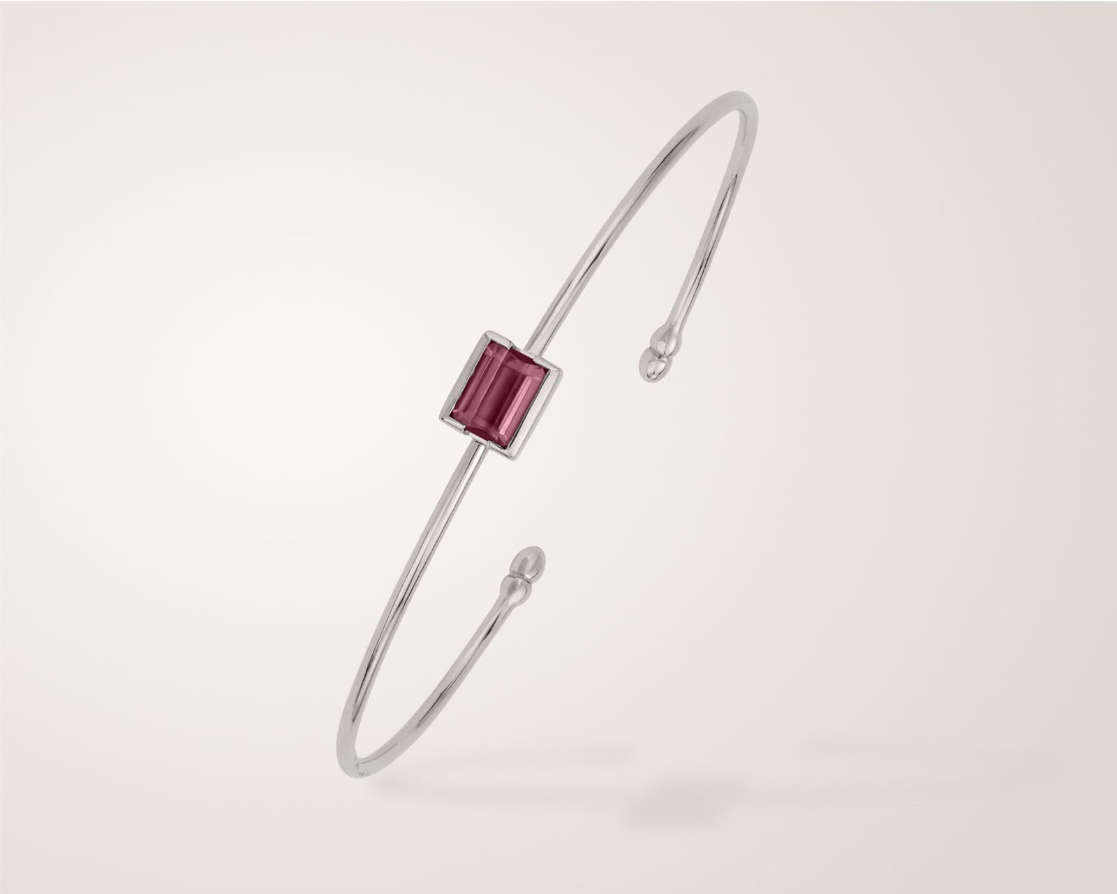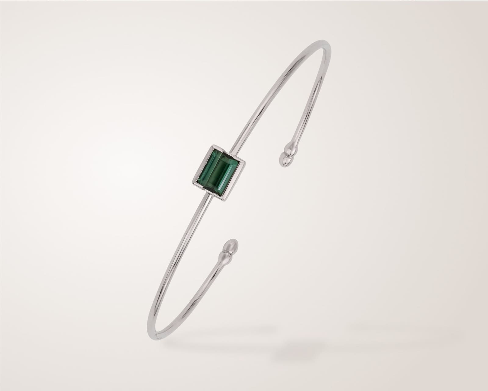 Bracelet rigide en fil rond, sublimé par une pierre fine octogonale au centre.