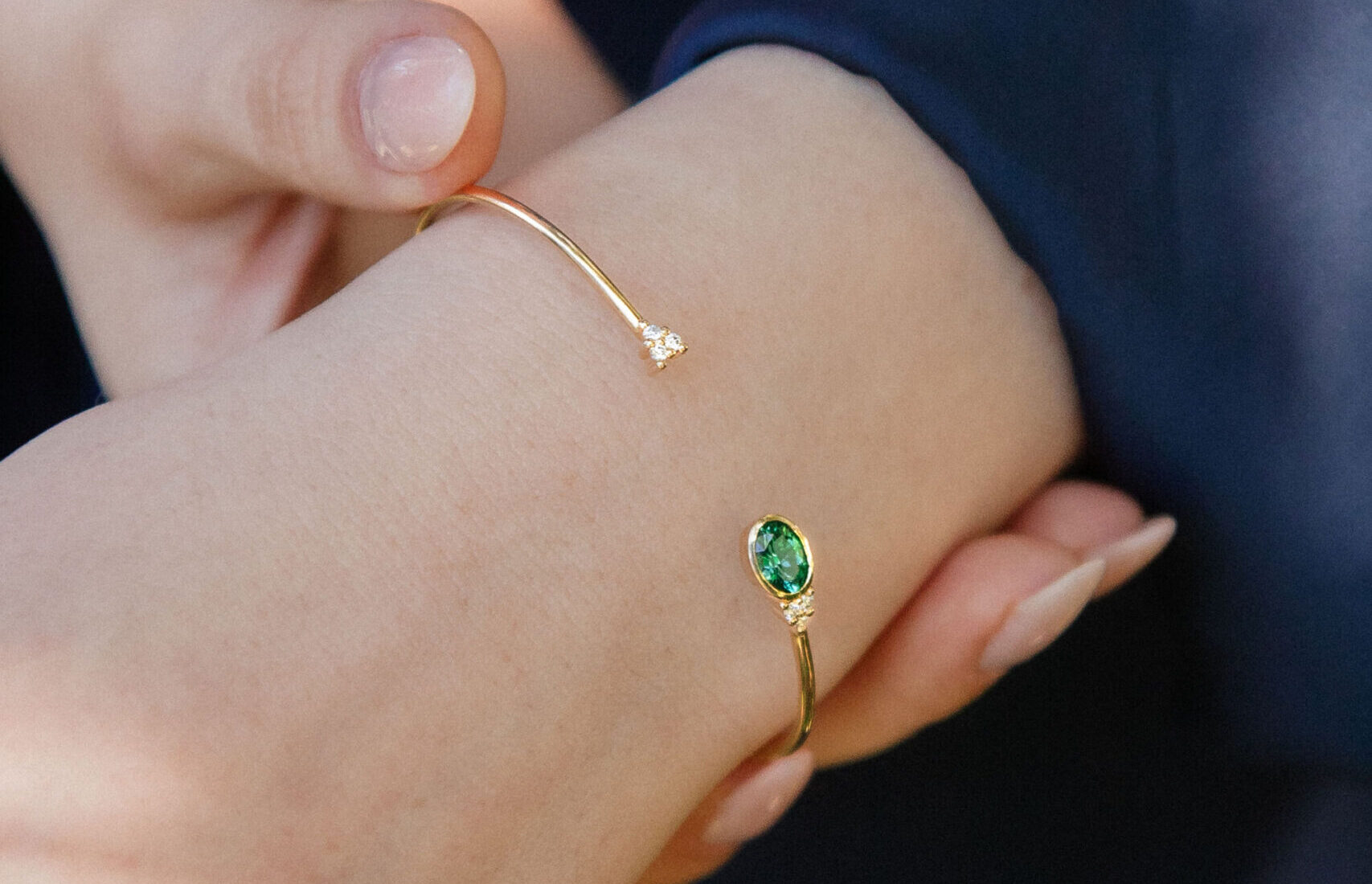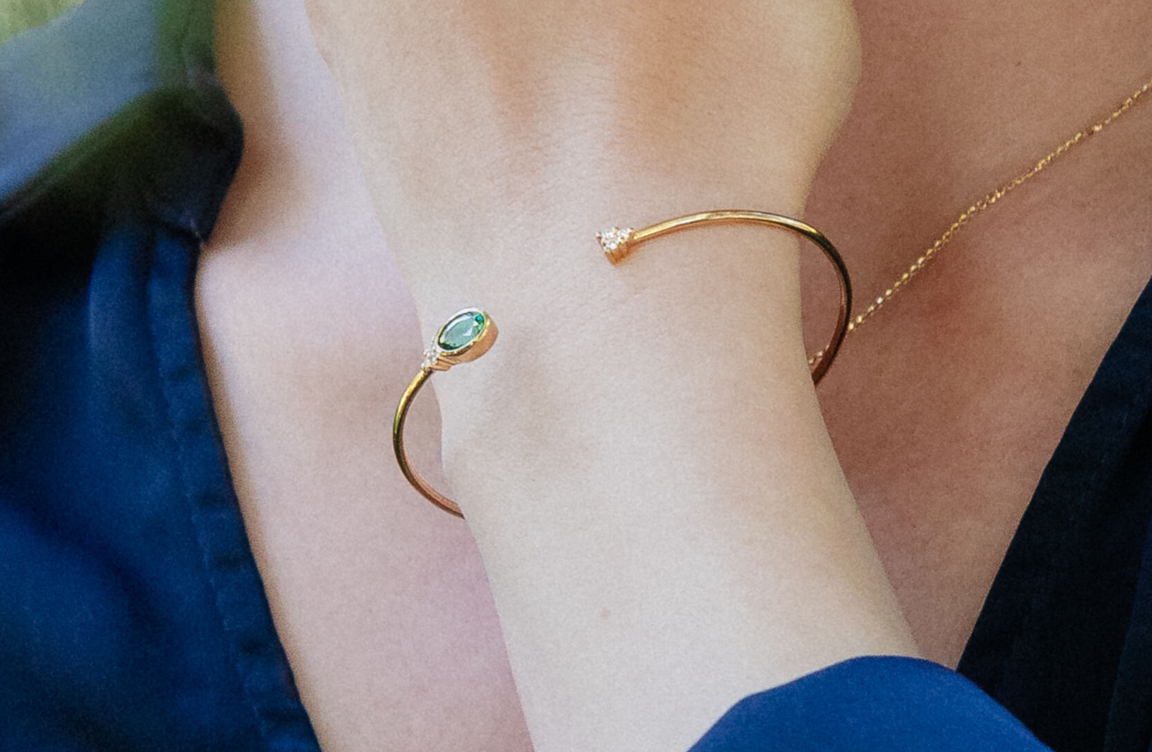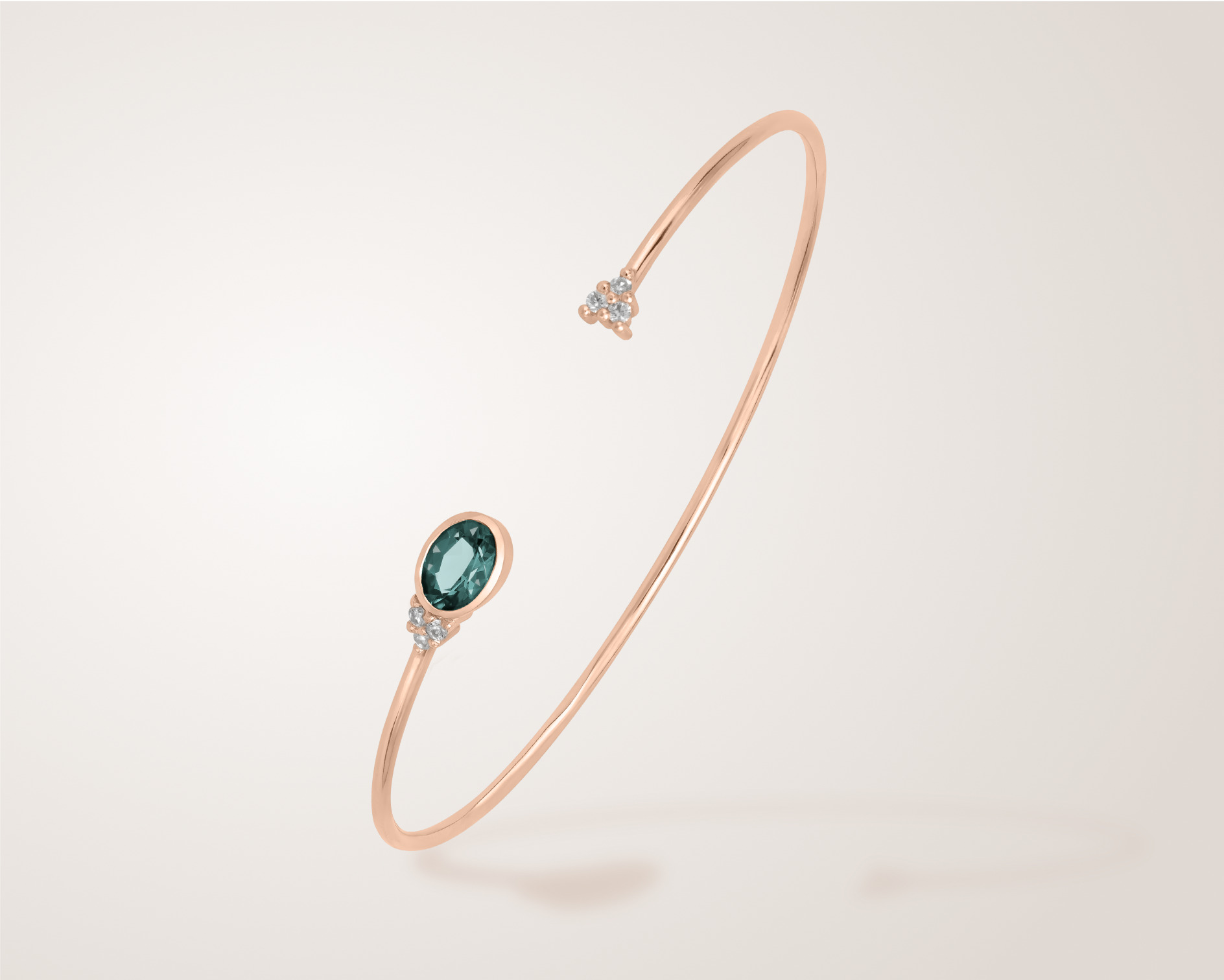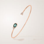 Jonc ouvert rigide en vis-à-vis, où se font face une pierre fine ovale éclatante et des diamants naturels.