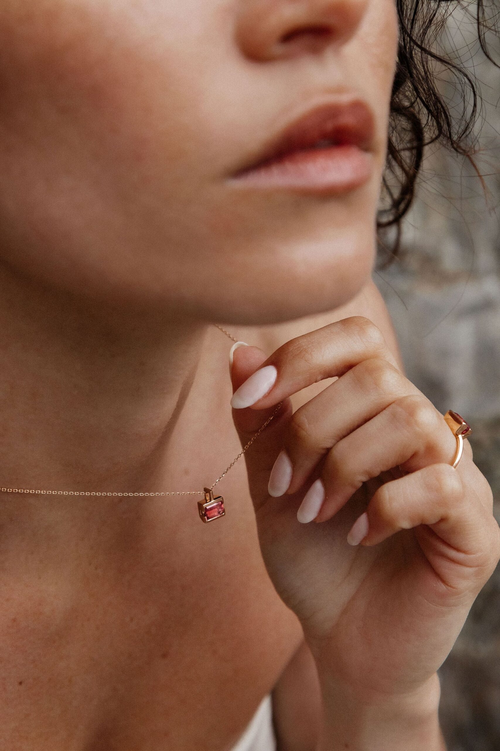 Suspendu à sa chaîne forçat, ce pendentif aux lignes géométriques affirmées, est serti d’une pierre fine octogonale.