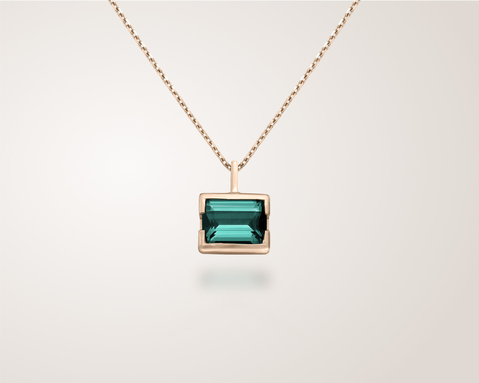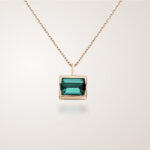 Suspendu à sa chaîne forçat, ce pendentif aux lignes géométriques affirmées, est serti d’une pierre fine octogonale.