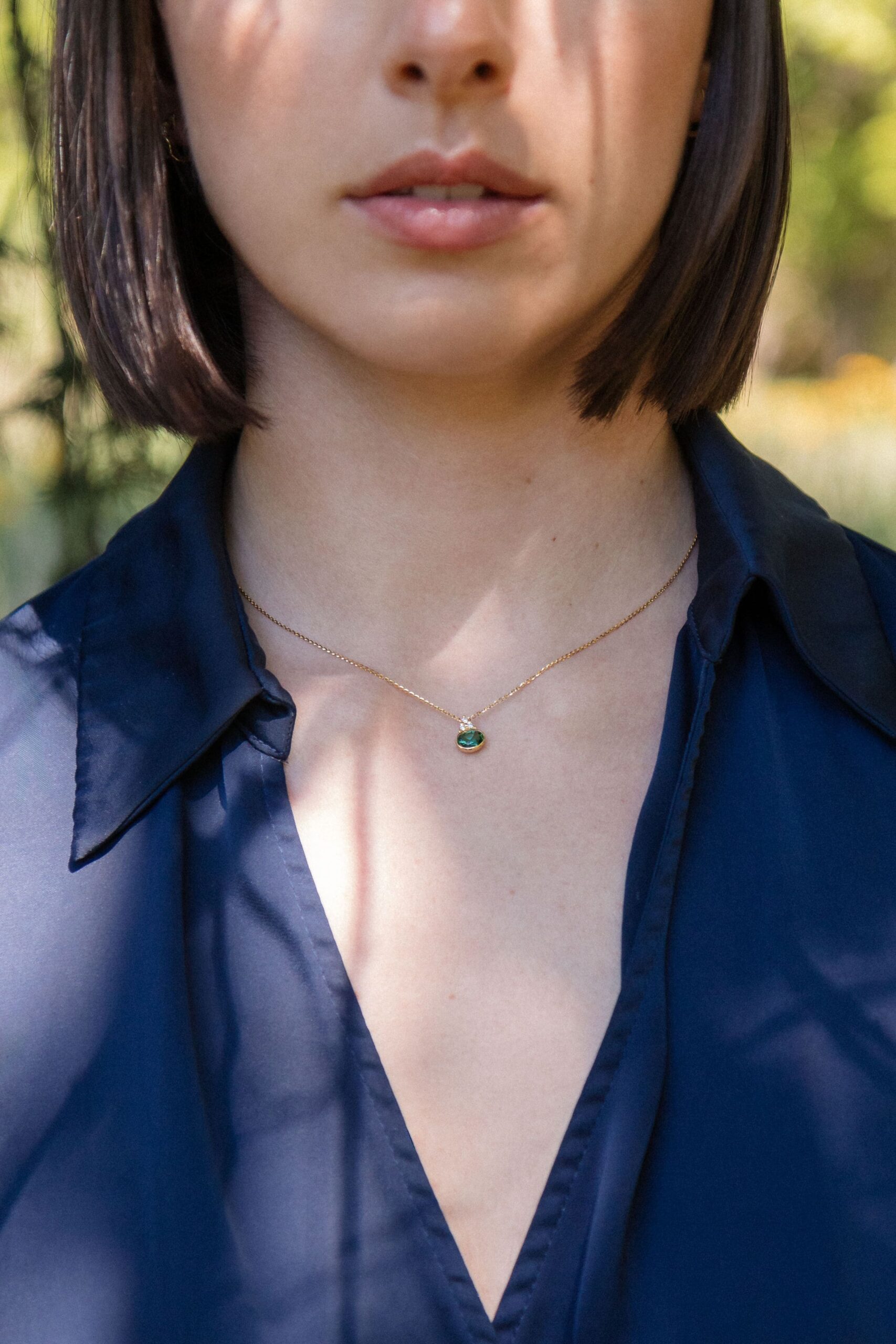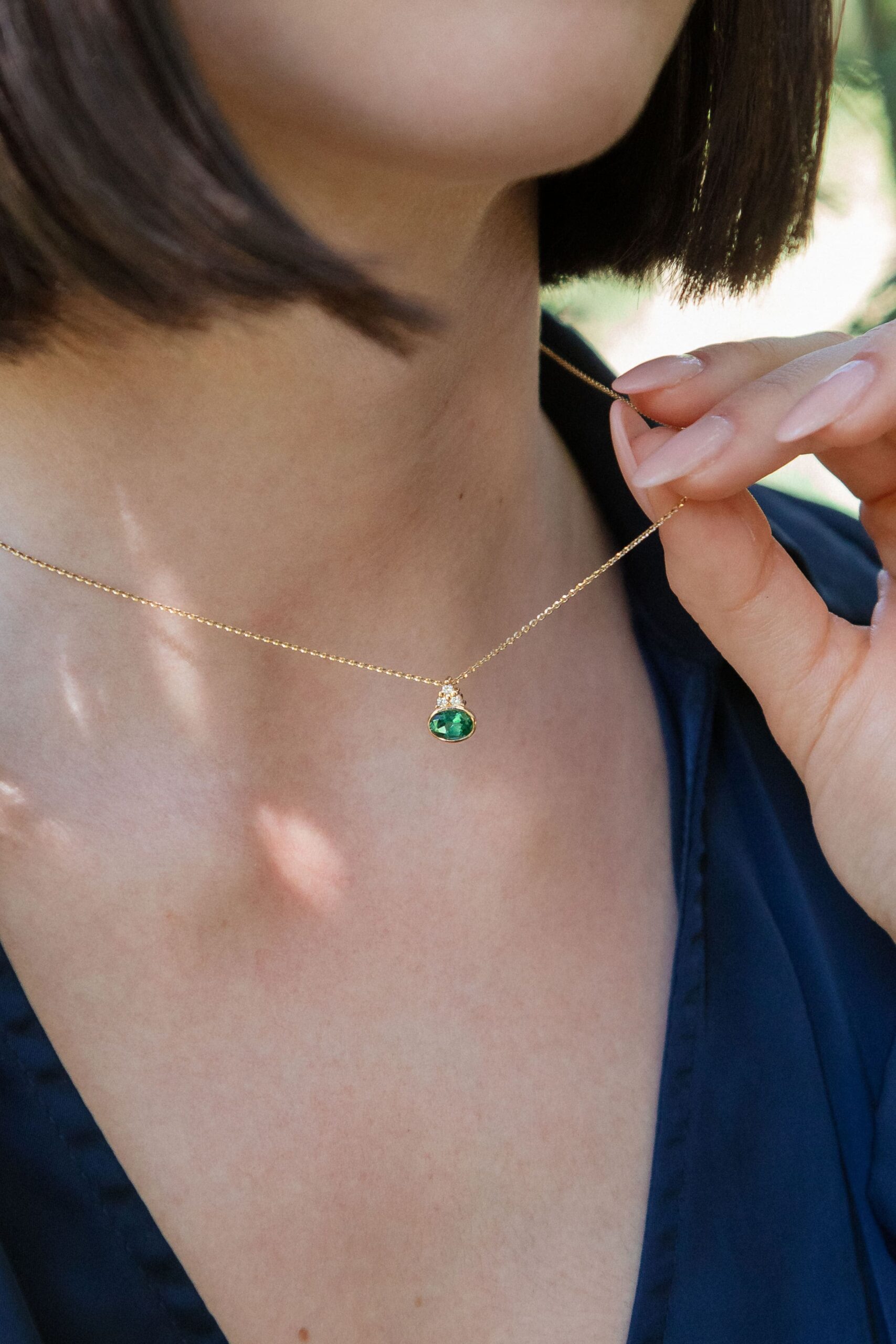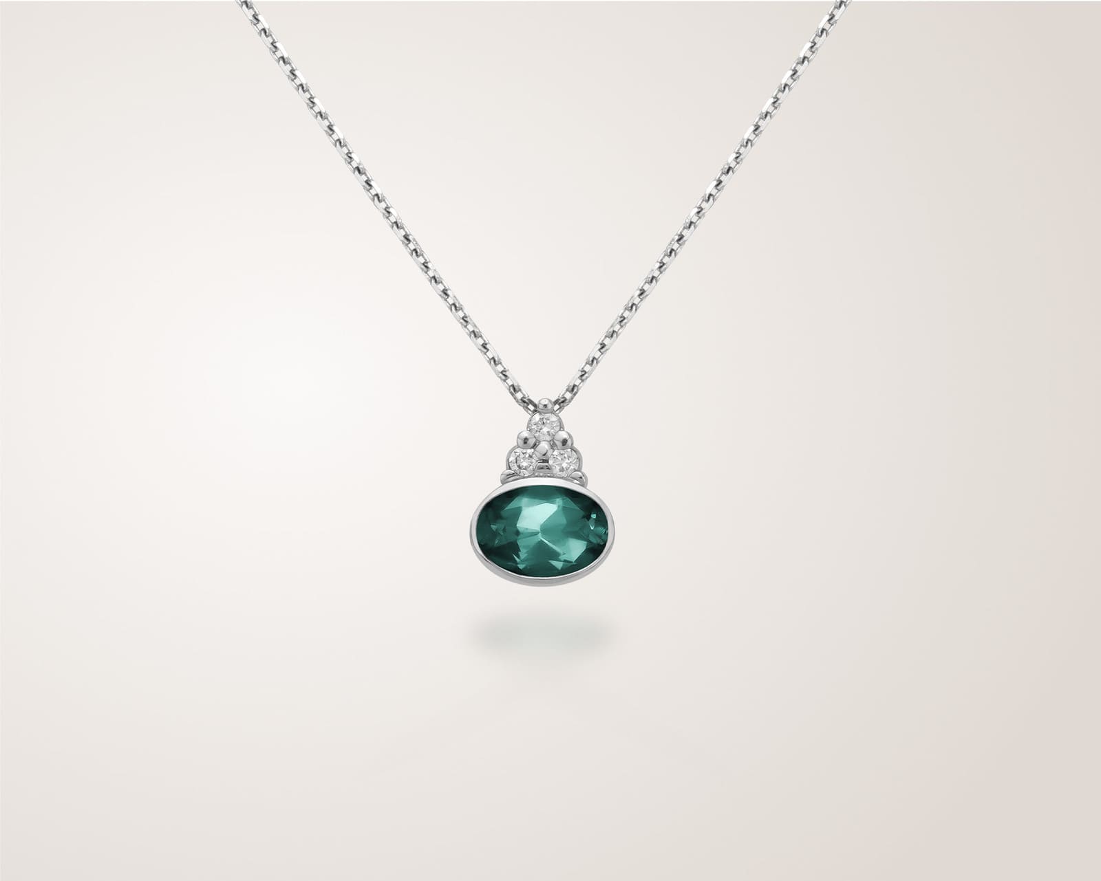 Pendentif délicat mettant en scène une trilogie de diamants naturels qui accompagnent une pierre fine au cœur du bijou.